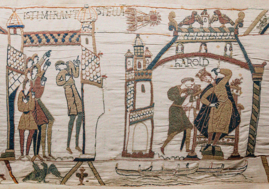 Нам говорят, что на огромном семидесятиметровом Гобелене из Байё, который документирует нормандское завоевание Англии в 1066 году, изображена всего лишь комета Галлея. Официальная история утверждает, что средневековые люди считали ее «зловещим предзнаменованием» для короля Гарольда II.