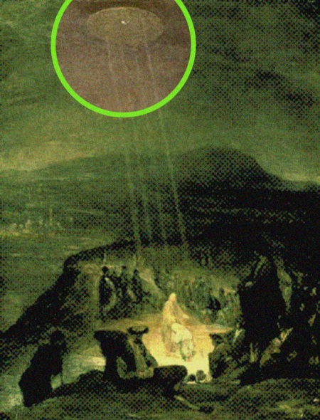 Необъснимо, но факт — все эти «ангелы», «божественное чудо» и «символизм» лишь отговорки «официальных» историков, чтобы скрыть от нас страшную правду: пришельцы сущестуют! Великие творцы прошлого оставили нам документальные свидетельства контактов с внеземными цивилизациями. В данном исследовании представленны неопровержимые факты, что Вифлеемская звезда на самом деле звездолет, а «облака» на фресках — летающие тарелки.