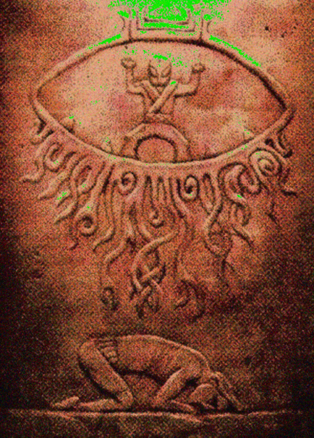 Рельеф на крышке гробницы, изображающий в сложной позе царя Пакала Великого, правителя майя седьмого века, расположенного в Храме надписей в Паленке, Мексика. На маске сидит красивый юноша, тело которого обвивает фантастическое растение, выходящее из пасти божества. Юноша смотрит вверх на «дерево жизни» — стилизованное изображение маиса в виде креста. На вершине креста сидит священная птица кетцаль, облаченная в маску бога дождя.