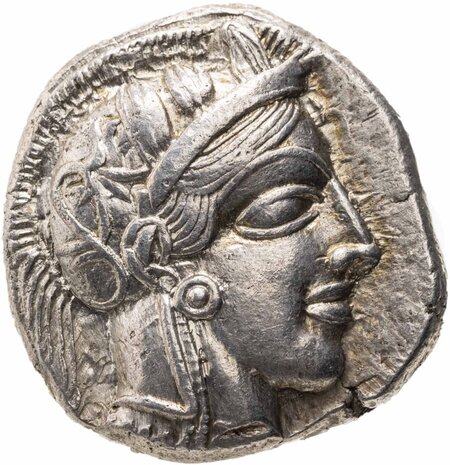 Слева — Древнегреческая серебряная тетрадрахма с портретом Александра Македонского. 297-281 гг до н. э. Справа — Тетрадрахма с профилем Афины. 454-404 годы до н. э.