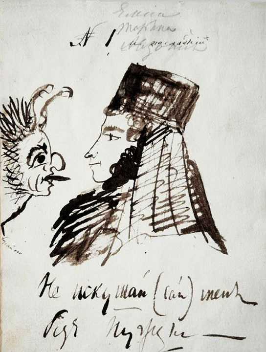 Автопортрет в монашеском клобуке, напротив беса. Пометка под рисунком: «Не искушай (сай) меня без нужды». А. Пушкин. 1829 г.