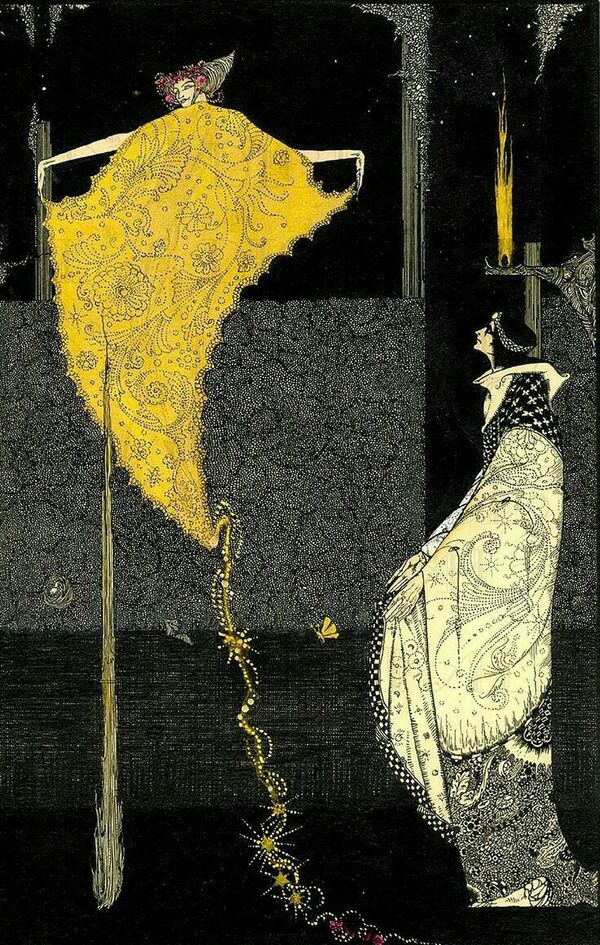Композиции и динамика иллюстрации походят на работы Обри Бёрдслея. По наполненности иллюстраций тоже. Оба художника сочетают огромное количество деталей с однотонными большими пятнами.