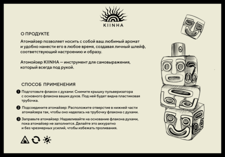 Набор хранителей ароматов: атомайзер и диффузор. Оба объекта — это способы взаимодействия с ароматом KIINHA, но на разных уровнях: личный и окружающий. Вместе они создают целостное впечатление, и позволяют пользователю глубже погрузиться в мир ароматов бренда и создать вокруг себя уникальную атмосферу.