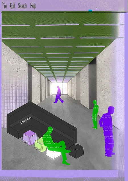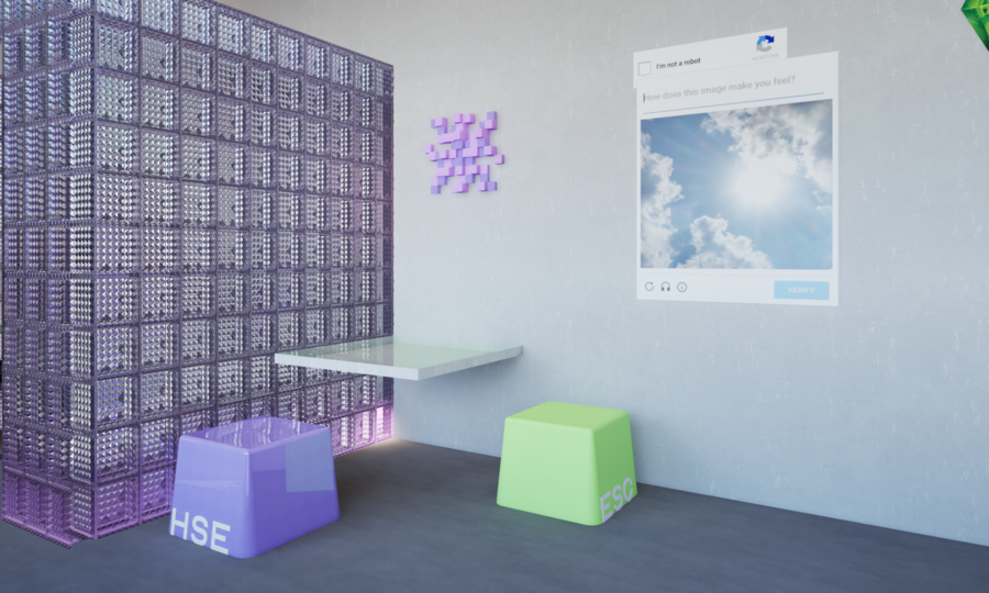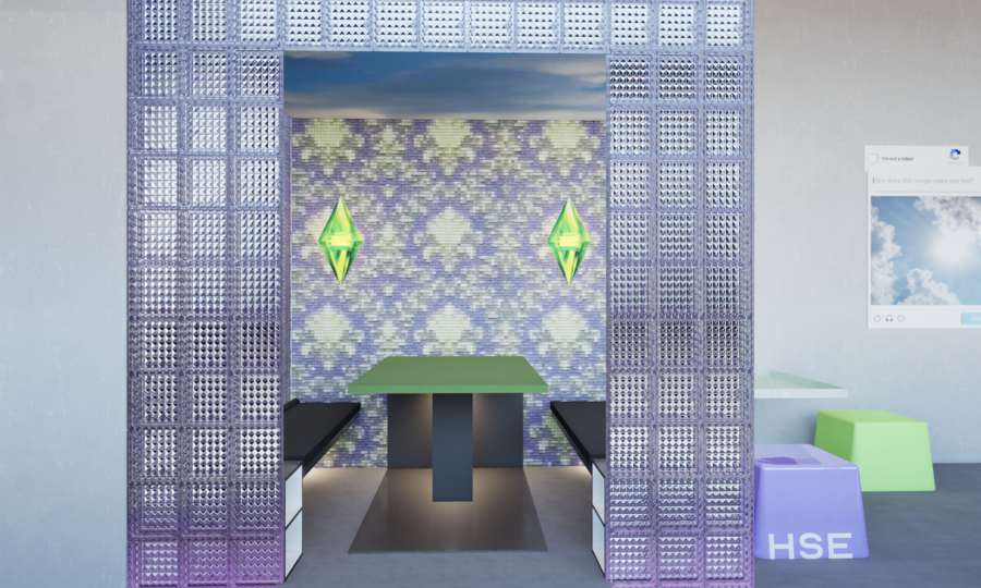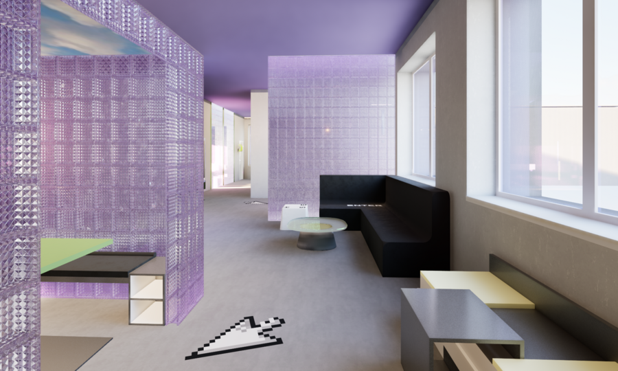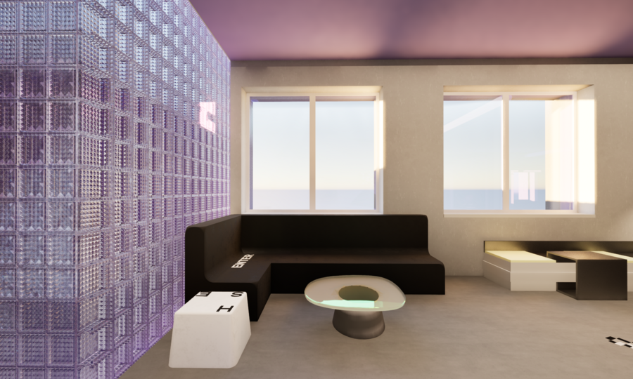 Дизайн мебели для зоны-отдыха вдохновлен компьютерной эстетикой, предметы стилизованы под клавиатурные клавиши