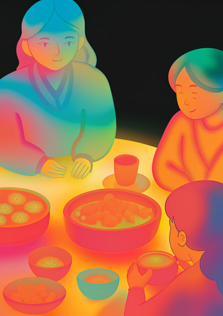 Generated promt: «A group of Asian people surrounds a large round table laden with bowls, Kazakh cups, and a teapot. Some sit or lean on the tables edge, others recline nearby — all engaged in relaxed conversation or enjoying food and drink. The atmosphere is cozy, communal, and festive, style cartoon and minimalistic».