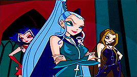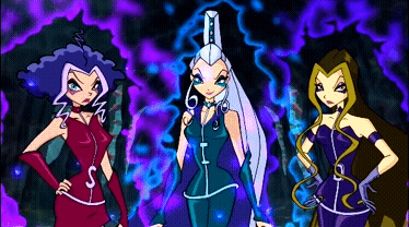 Слева и Справа персонажи Айси, Дарси и Сторми, фрагменты из анимационного сериала «Винкс»