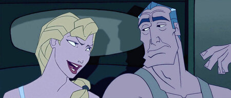 Слева персонажи Хельга Синклэир и Рурк; Справа Хельга Сиклэир фрагменты из полнометражного мультфильма «Атлантида: Затерянный Мир»