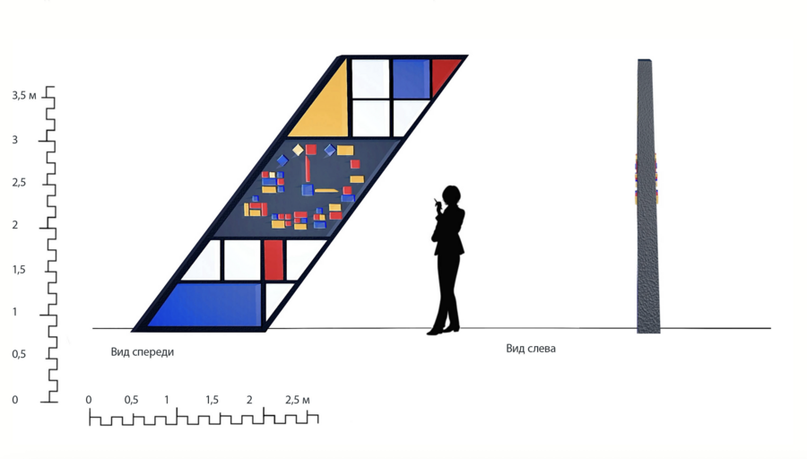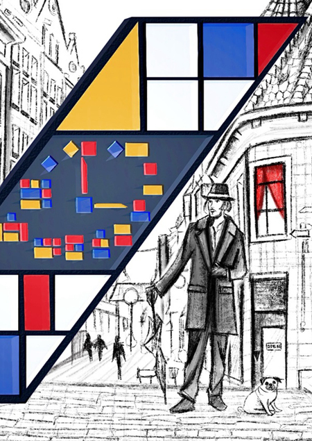 Арт-объект, вдохновлённый стилем Тео Ван Дусбурга, представляет собой часы с особыми цифрами в виде геометрических фигур, выполненные в духе неопластицизма. Геометрические формы, диагональная композиция и основные цвета — красный, синий, жёлтый — создают ощущение движения и ритма времени. Контраст линий и плоскостей передаёт гармонию порядка и динамики. Эти часы вызывают чувство энергии и сосредоточенности, служат не только функциональным предметом, но и передают идею единства искусства, порядка и пространства.