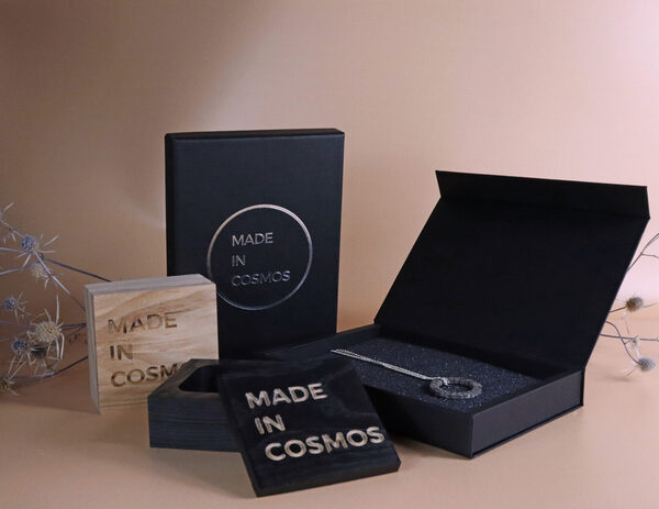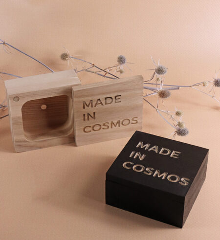 У Мэйд Ин Космос упаковка строится на двух основных формах: деревянных коробочках и плотных картонных футлярах с магнитом. Дерево добавляет тактильности и ощущения ценности, превращая упаковку в шкатулку, которую хочется сохранить. Картонные коробочки закрываются мягким «щёлком», подчёркивая современность и аккуратность бренда. Вместе они создают простой, но выразительный образ, в котором упаковка становится частью впечатления, а не только защитой изделия.