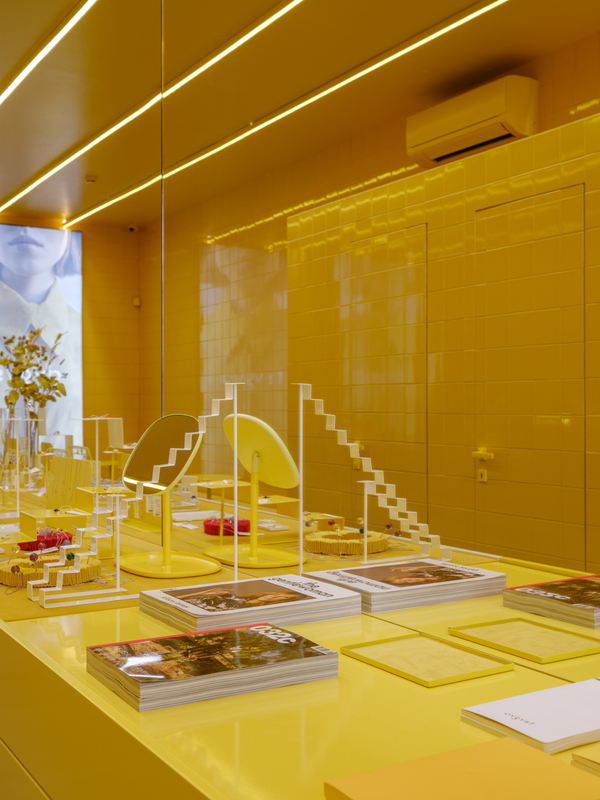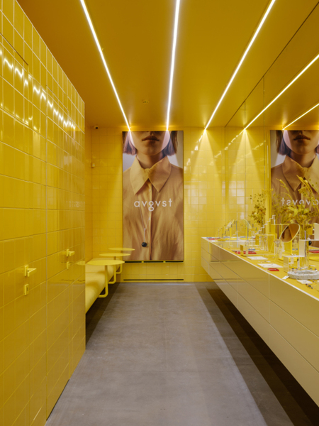 Витрины AVGVST выделяются фирменным жёлтым цветом и минималистичным стилем. Пространство наполнено светом, сама витрина напоминает арт-объект: украшения размещены так, чтобы каждый предмет смотрелся как экспонат и был легко читаем зрителем.