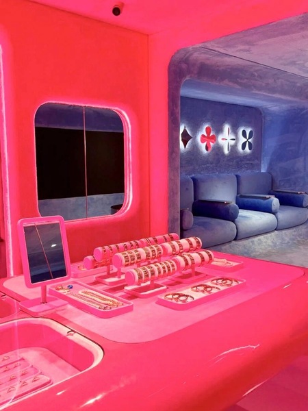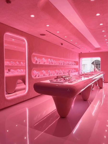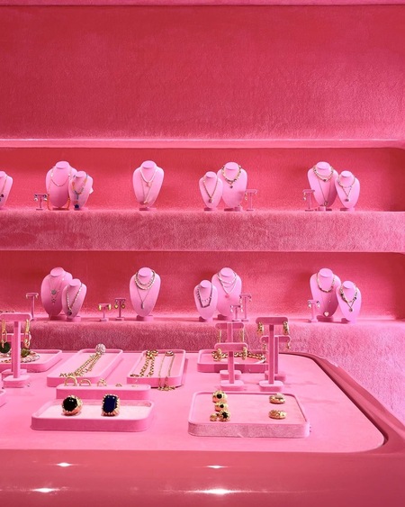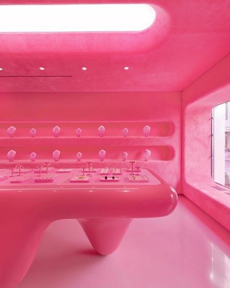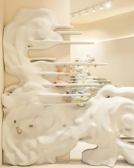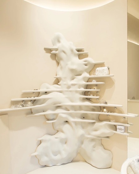 La Manso оформляет свою витрину в футуристичном бежевом стиле с нестандартными формами. Украшения лежат, словно арт-объекты, а интерьер напоминает современную скульптурную инсталляцию, где пластик и свет задают настроение пространства.