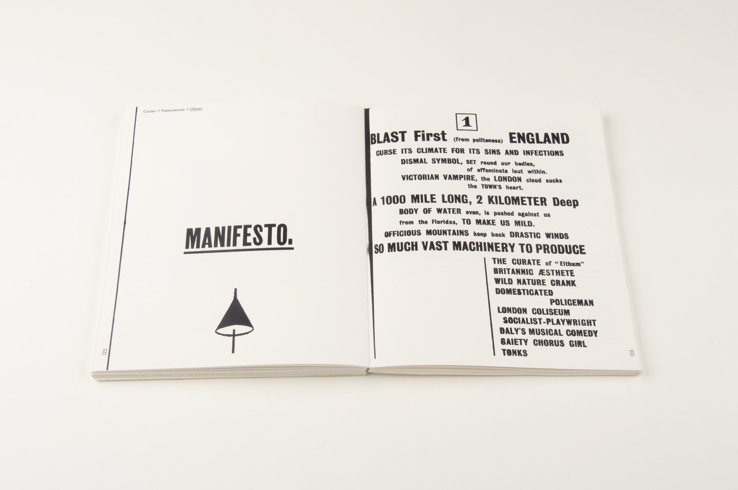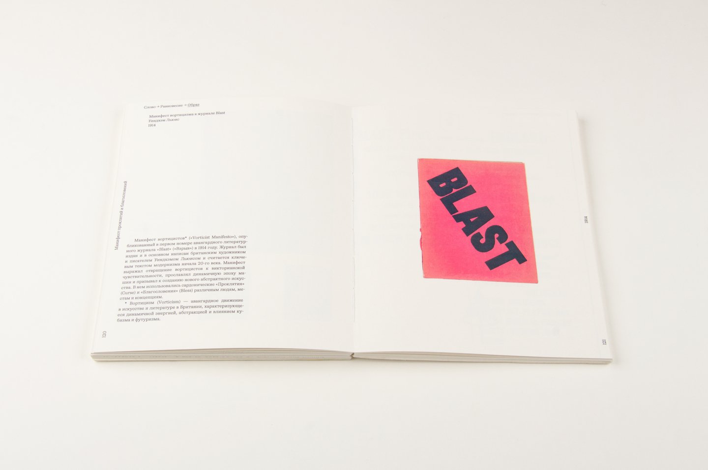 Концепция и макет книги отсылают к пространству галереи, по которому читатель перемещается, изучая экспликации к работам и параллельно слушая рассказ «экскурсовода» (авторские комментарии). Манифесты как бы помещаются в выставочный зал, и тем самым мы рассматриваем их в первую очередь как визуальные объекты.
