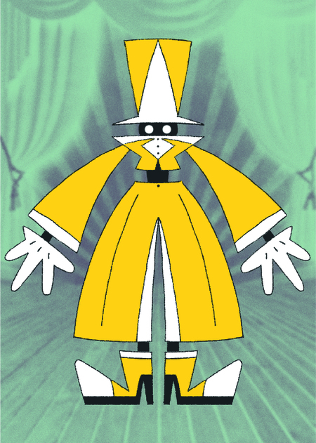 - Character Description: A circus magician in yellow-white costume, big cilindre hat, bif white gloves, tall boots, wide sleeves and pants, full black head and moon white eyes, no mouth no any facial features. The image is attached.