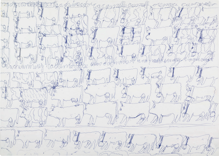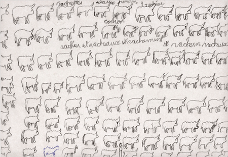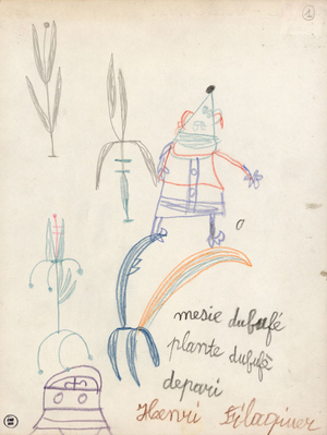 «В работах Анри черным грифелем и цветным карандашом изображены темы, вдохновленные повседневной жизнью — мельница, церковные свечи, животные — смысл каждого предмета начертан непосредственно на рисунке»