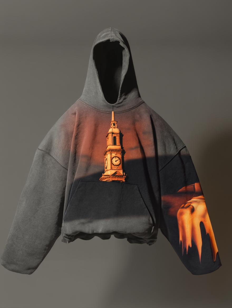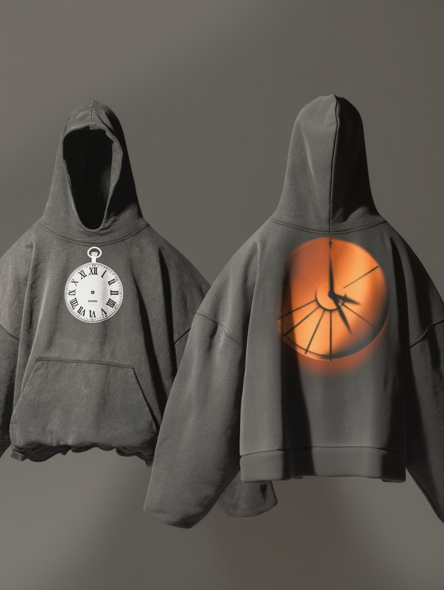 Худи с «невозможной тенью» Объект печатается спереди, а тень — сбоку или сзади, будто живёт вне логики.