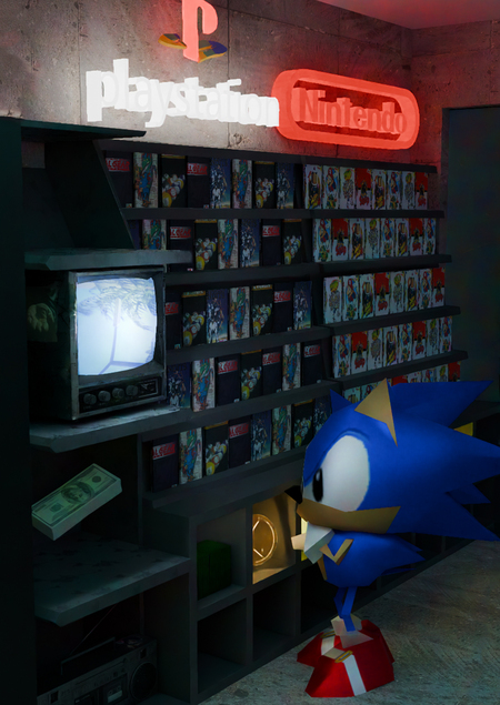 Это скрытое игровое пространство для персонажей эпохи игр PS1–PS2. Здесь они отдыхают от своих квестов: играют в аркады, запускают приставки, перебирают диски. Ирония в том, что герои становятся игроками и частью музейной витрины своего времени.