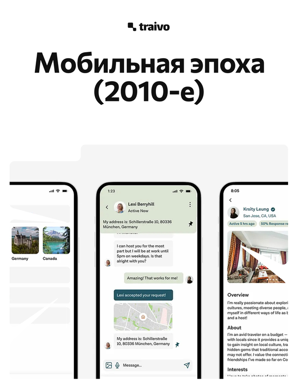 Важным этапом стало развитие онлайн-сообществ и продуктов, таких как Couchsurfing (основан в 2004 году) и Airbnb (основан в 2008 году). Эти сервисы позволили путешественникам находить уникальные места для проживания и общения от таких же пользователей, как и они сами. Couchsurfing стал популярным среди тех, кто искал не просто жильё, а культурный обмен и новые знакомства, а Airbnb предложил путешественникам альтернативу традиционным отелям, давая возможность остановиться в частных домах и квартирах. Эта тенденция стала важной частью культурного обмена и расширила горизонты путешественников, позволяя им выбирать места для проживания в зависимости от их интересов, предпочтений и без привязки к отдельной инфраструктуре.