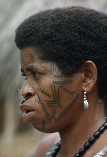 Женщина из народа маконде с татуировками динембо на лице и штифтом в носу, Южная Танзания, XXI век / Суданская женщина со шрамами на лице, 1890-е гг.