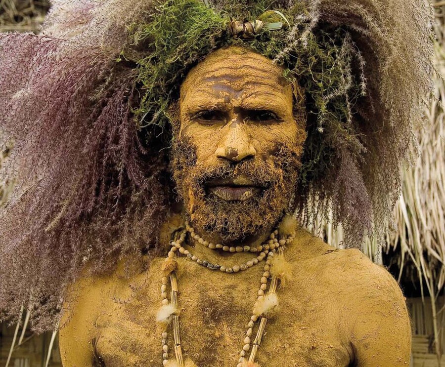 Папуасский народ чимбу: мужчина, выкрашенный жёлтой глиной, в травяном парике. Маунт-Хаген, провинция Уэстерн-Хайлендс, Папуа-Новая Гвинея, 2016 год