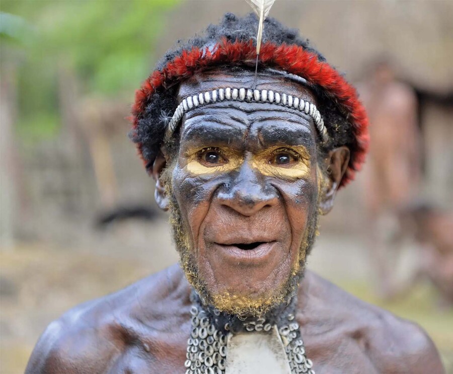 Папуасы используют яркие природные пигменты, особенно желтую глину и красные оттенки, чтобы создавать сложные узоры и маскировочные рисунки на лице и теле. Эти раскраски служат символом связи с природой и духовным миром, а также защищают кожу против насекомых и солнечных ожогов.