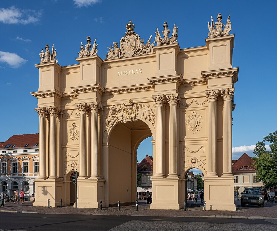 Потсдамские Бранденбургские ворота 1770–1771 годов и берлинские ворота 1788–1791 годов показывают два этапа осмысления триумфального мотива в прусской архитектуре. Потсдамские, созданные Гонтаром и Унгером, стилизованы под античные трофеи и напоминают римские арки, оставаясь городскими воротами. Берлинские ворота Лангханса с дорическим ордером и квадригой превращаются в политический символ. Оба сооружения демонстрируют, как Пруссия использовала архитектурный язык триумфа для утверждения власти и государственной идеи.