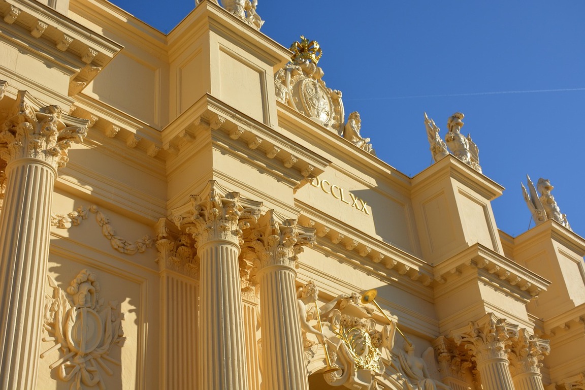 Фасады Бургтеатра в Вене построены так, что центральный арочный вход явно отсылает к Арке Тита в Риме. Боковой вход, показанный на третьей фотографии, перекликается с композицией Триумфальной арки Септимия Севера в Риме: проём подчинён центральной оси и поддерживает симметричный ритм фасада. Такое сочетание античных моделей придаёт театру одновременно величественный образ и упорядоченную архитектурную композицию, адаптированную к культурной функции здания.