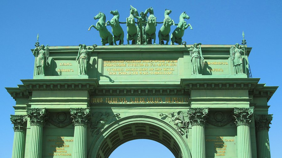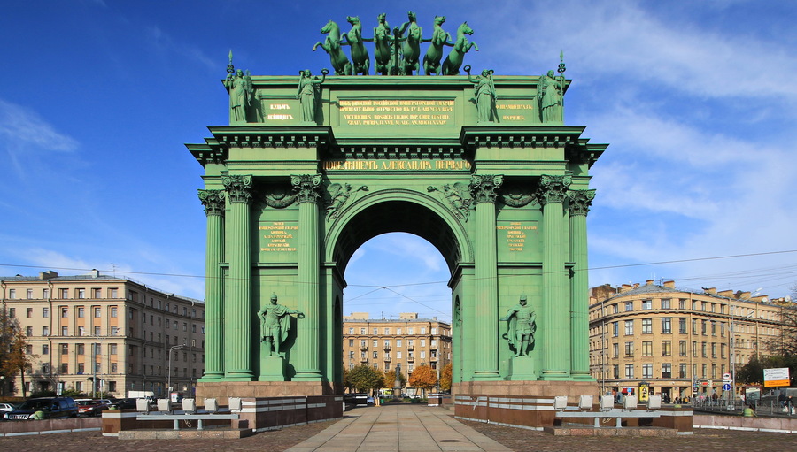 Нарвские триумфальные ворота (1827–1834) и Московские триумфальные ворота (1829–1834) показывают адаптацию триумфальной арки в российском контексте. Нарвские ворота, связанные с именами Стасова и Кваренги, отмечают победу России над Наполеоном и оформляются в мощной классической композиции с подчёркнутой героикой. Московские ворота Осипа Бове повторяют этот мотив, но усиливают декоративность, включая ордерную систему, символические рельефы и патриотическую иконографию. Оба сооружения используют римский прототип, однако трансформируют его в национальный знак победы, объединяющий память, империю и городское пространство.