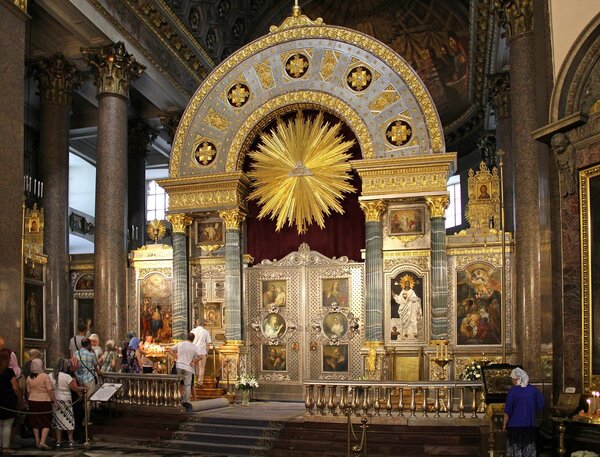 Мотив архивольта и арочного пролёта продолжает своё существование в иконостасах соборов, где он символизирует переход к ещё более сакральной зоне внутри храма. После того как верующий проходит через главный вход с архивольтом, арочные элементы иконостаса создают визуальное и духовное деление, акцентируя святость алтарной части и усиливая ощущение последовательного погружения в священное пространство.
