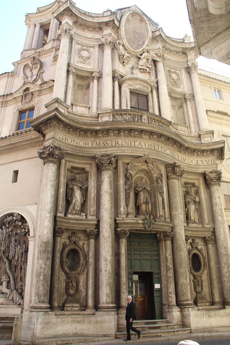 В «Сан-Карло алле Куатро Фонтане» Борромини радикально переосмысляет арочный мотив, создавая ощущение, будто знаменитая Арка Константина в Риме была «погнута» и вписана в динамичное пространство фасада. Центральный проём словно изгибается в ритме фасада, боковые элементы подчиняются криволинейной композиции, а использование волнообразных форм и изогнутых ордеров усиливает эффект движения и пластики. Арка здесь уже не статичный триумфальный символ, а живая, текучая структура, играющая с перспективой и создающая впечатление пространственного напряжения.