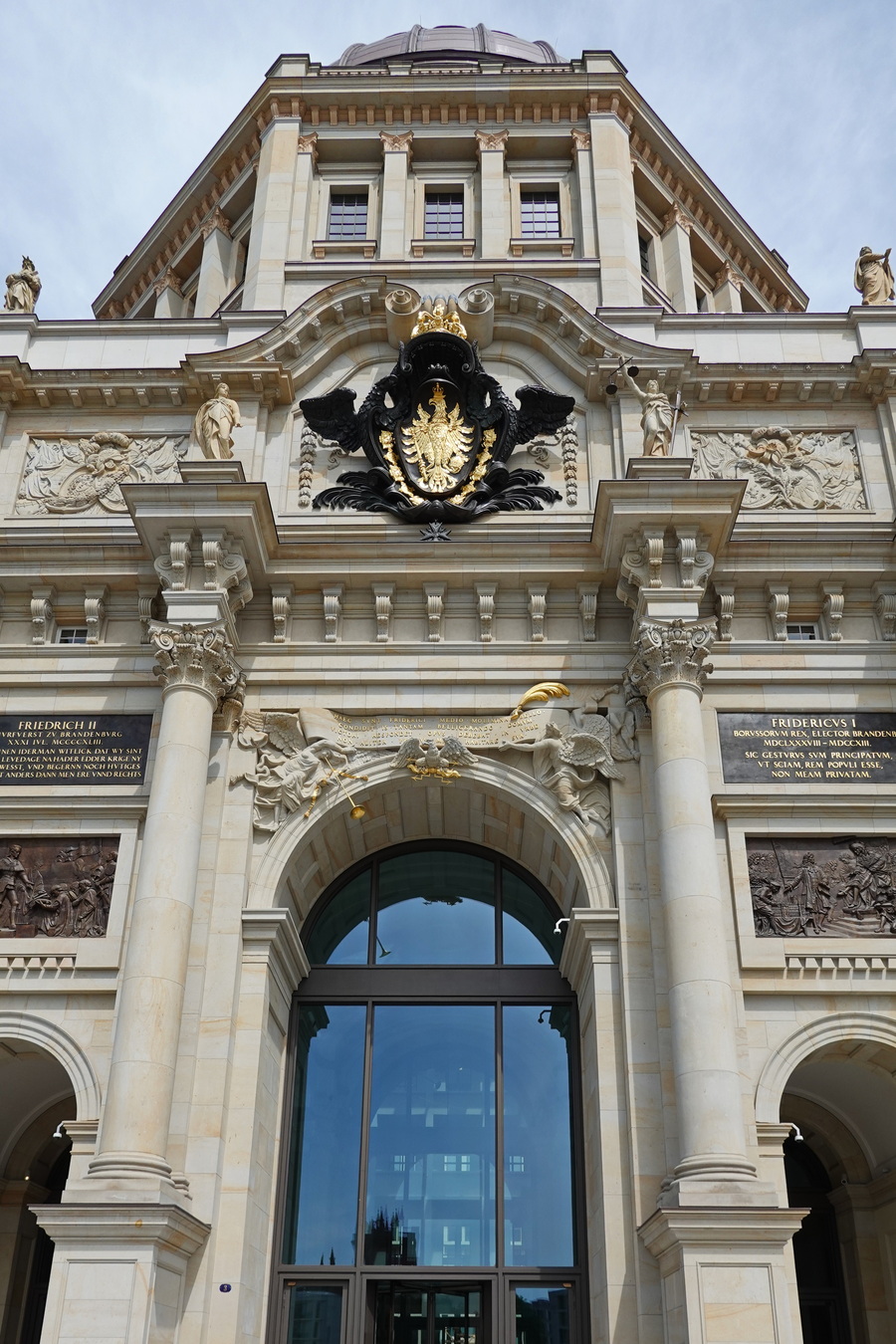 В Берлинском королевском дворце входная группа отражает идею изогнутой арки Константина, но трактована более сдержанно. Центральный проём подчёркивает парадный характер фасада, а боковые элементы лишь намекают на арочную динамику, создавая ощущение гармонии и упорядоченности. В отличие от римского прототипа и Сан-Карло алле Куатро Фонтане, здесь арочный мотив служит скорее декоративной и композиционной цели, интегрируясь в строгий, монументальный образ дворца и подчёркивая парадность, но без драматического излома линии.