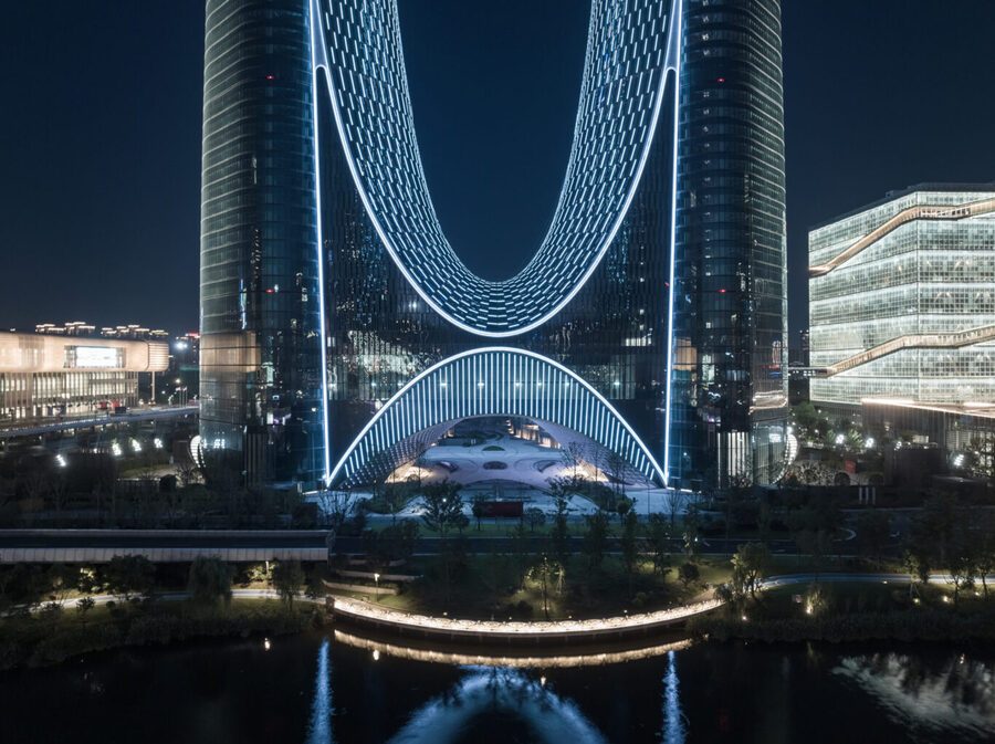 «Гренланд Ханчжоу Центр» демонстрирует современную интерпретацию арочного мотива в формате небоскрёба. Его силуэт напоминает перевёрнутую, сглаженную минималистичную арку: лёгкая изогнутая форма создает ощущение динамики и устремлённости вверх, сохраняя визуальную связь с классическим мотивом, но полностью переосмысляя его масштаб, функцию и материал. Здесь арка уже не про проход или монументальность, а о пространственной экспрессии и архитектурном акценте в городской панораме XXI века.
