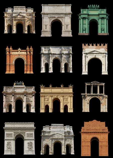 Я выделил этот раздел, чтобы сосредоточиться на триумфальных арках, которые можно рассматривать как прямых правопреемников римских арок, а также на архитектурной репрезентации отдельных арочных мотивов — не на совокупности элементов, формирующих привычный образ арки, а на деталях, заимствованных из её структуры. В качестве примеров я приведу не только полностью сформированные торжественные сооружения, но и архитектурные элементы, использующие структуру арки: архивольты, антаблементы, ордерные фризы и другие детали. Эти мотивы не являются исконно римскими: они существовали до и после Рима, однако именно в римской арке структуры взаимодействуют в характерной для неё форме.