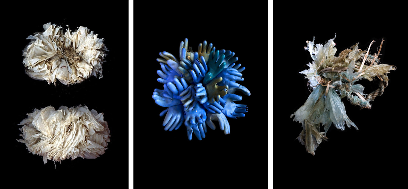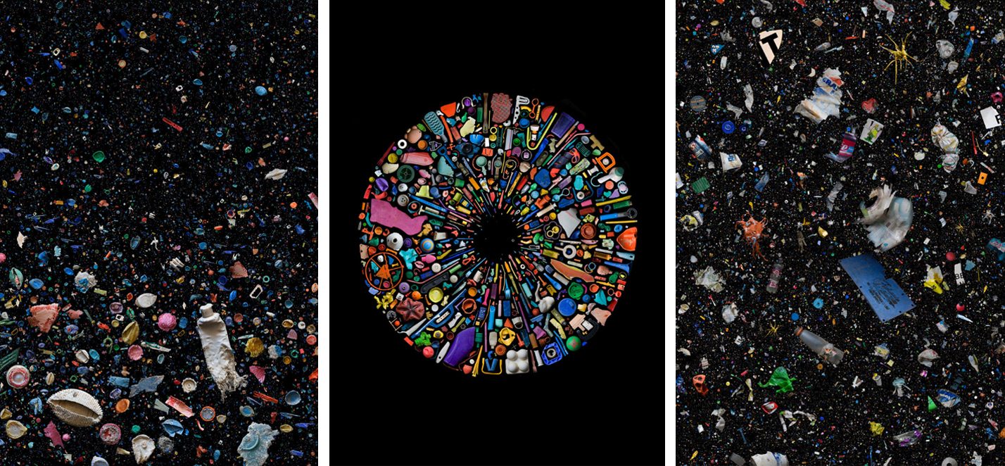 Британская фотограф Мэнди Баркер в сериях своих работ, представленных выше, создает пронзительные образы пластикового загрязнения океанов. Ее работы, напоминающие одновременно и научные образцы, и поэтические композиции, показывают, как пластик становится частью морских экосистем. Как отмечает исследователь антропоцена Джейсон Мур, «пластиковые отходы сегодня — это не просто мусор, а новый тип геологического слоя, который будет сохраняться тысячелетиями» Moore, J. W. Capitalism in the Web of Life / J. W. Moore. — L. : Verso, 2015. — Р.134)