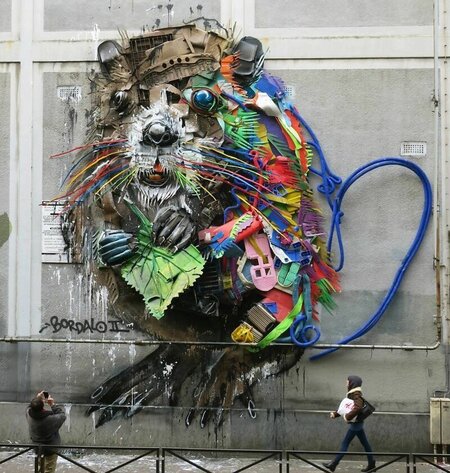 Португальский художник Бордо II в серии «Big Trash Animals» делает скульптуры исчезающих животных из мусора. Он берет пластиковые бутылки, шины и старую электронику и собирает из них фигуры зверей. Получается, что вещи, которые вредят природе, сами становятся ее символами. Это как двойное послание: он и на проблему указывает, и показывает, как именно она выглядит.