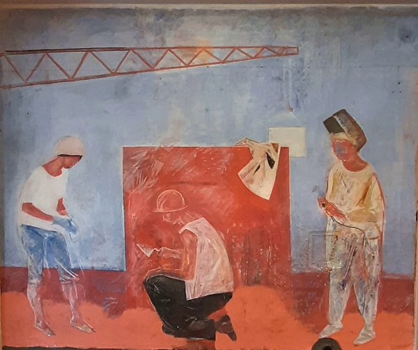 Говорков Иван Владиславович «Строители», 1976 (штукатурка, бязь, левкас, клей ПВА, проклейка, темпера) 300×700 см
