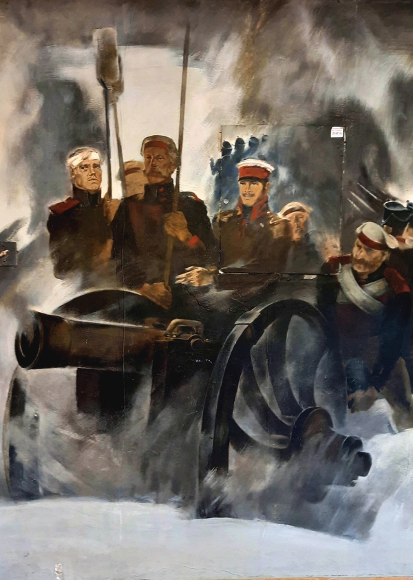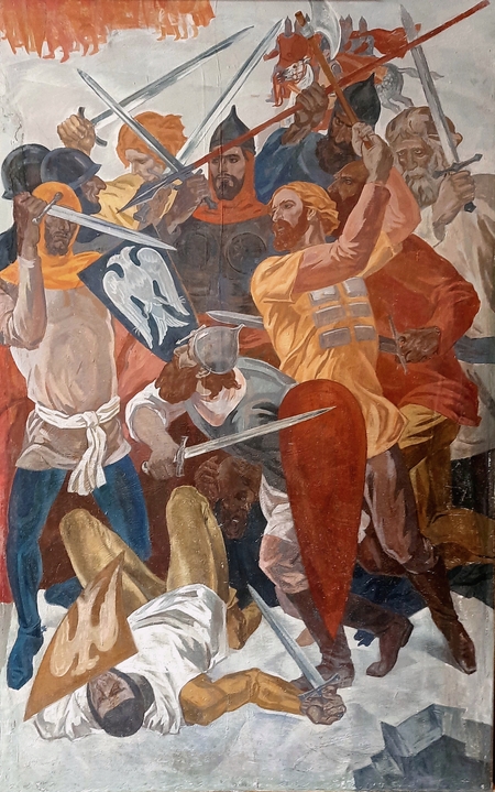 По обе стороны группы разворачиваются сцены сражения, частично воссоздающие эпизоды Бородинской битвы. При всех своих достоинствах роспись напоминает все же станковое полотно, с присущей ему широкой живописностью и свободой письма.