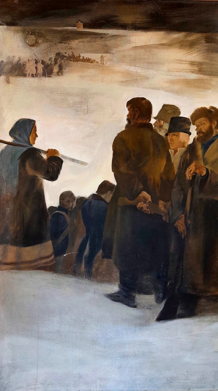 Эти особенности мало согласуются с понятием монументальной фрески, хотя отдельные детали, такие, например, как пушка, окутанная снежной поземкой, или казачьи кони, написаны с превосходным чувством пластической формы.