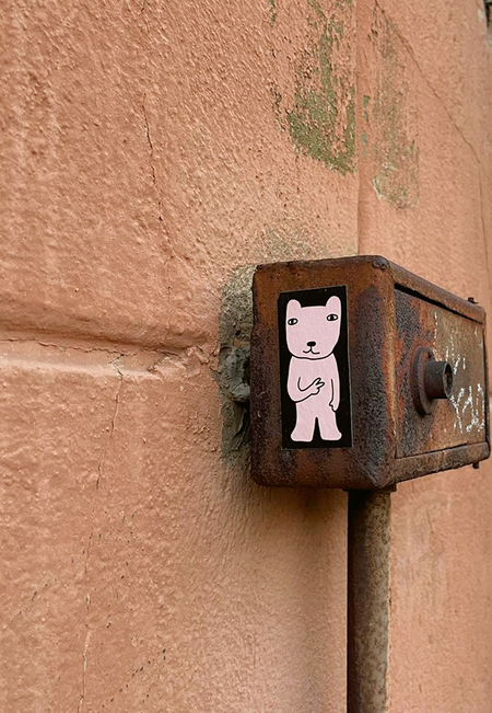Стикеры невольно заставляют человека входить в игру и некий поиск персонажа. Человек находит в серьёзной, монументальной среде — розового персонажа-собачку. Которая освобождает своего нашедшего от условностей городской среды. Порождая в человеке наивную, детскую радость от простой розовой наклейки на столбе.