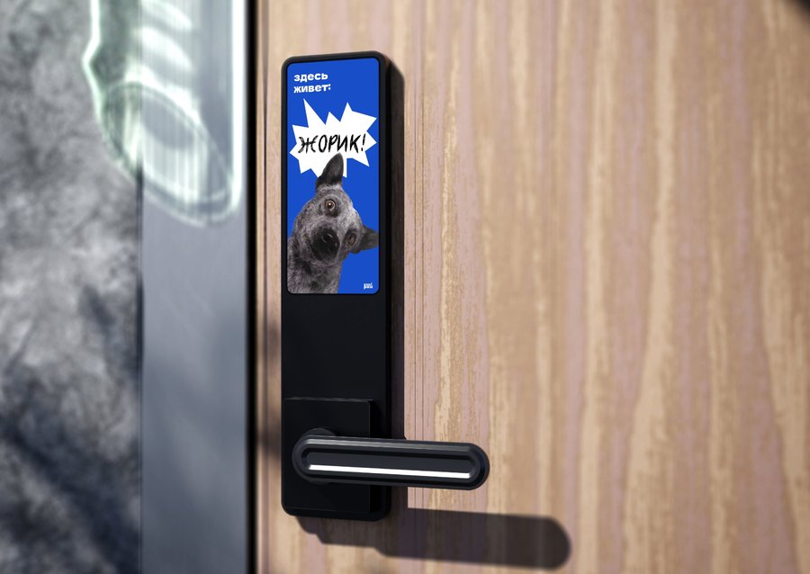 Create a realistic image of a brochure for a pet-friendly hotel. The brochure should feature the hotel’s logo (see attached file) and a photo of a staff member wearing a white T-shirt with the same logo. The staff member is inside the hotel, hugging a dog in a warm, friendly way. Include the Russian text 'Ждём твоего хвостика у нас' (which means 'We’re waiting for your furry friend with us'). The design should look clean, modern, and professional, suitable for promotional use.
