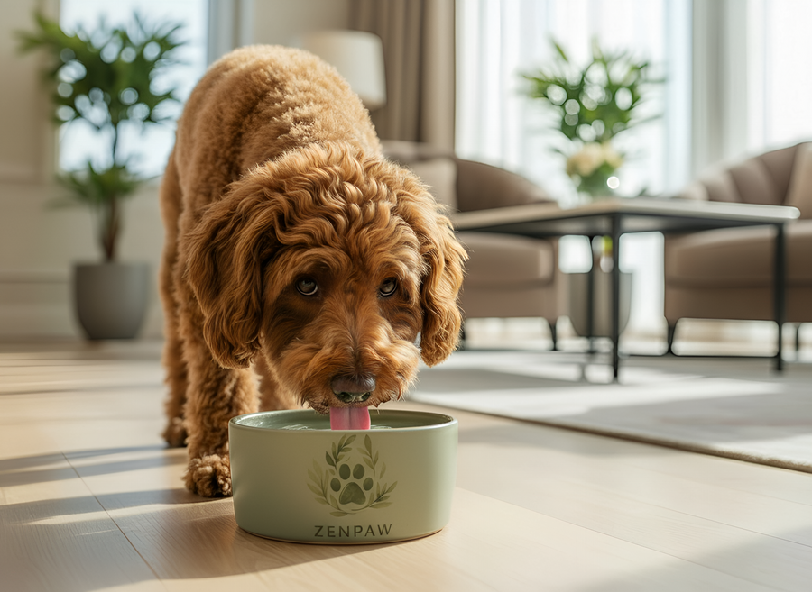 Create a realistic image of a brown Poodle dog with brown eyes drinking water from a bowl that features logo (see attached file). The scene is set indoors inside a beautiful hotel. Use natural indoor lighting, high-quality photorealism, and a style suitable for lifestyle or brand advertising.