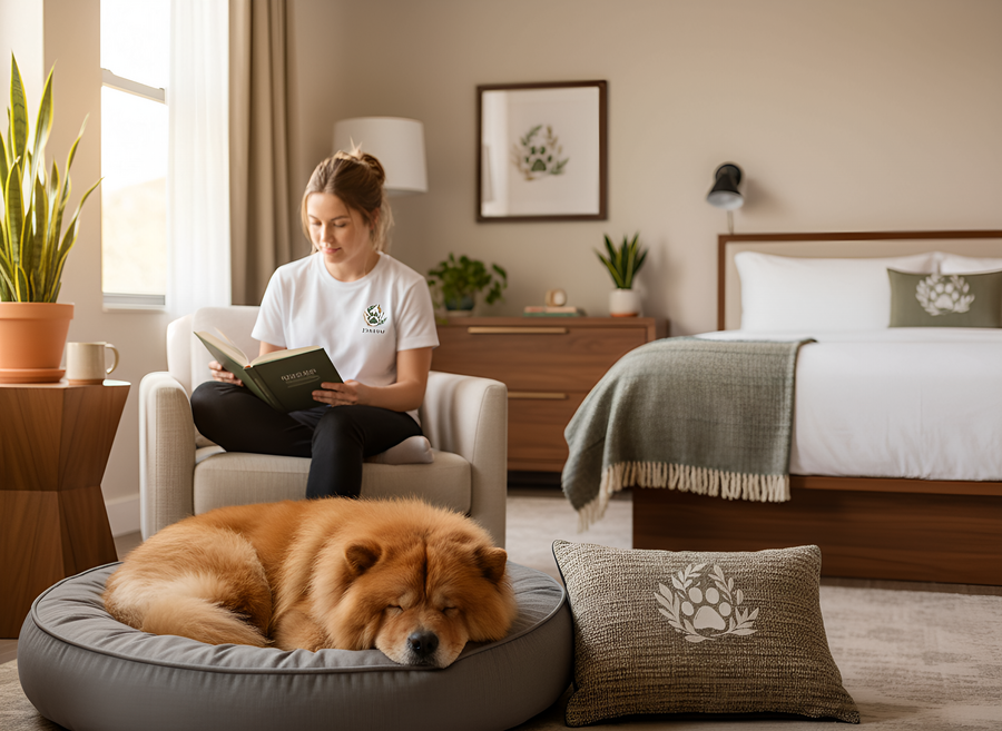 Create a realistic image of a cozy pet-friendly hotel room. A young woman is sitting in the background, comfortably reading a book. She is wearing a white T-shirt with the hotel’s logo (see attached file). In the foreground, a Chow Chow dog is resting peacefully in a soft pet bed. The room has a warm, inviting atmosphere with natural light, stylish modern decor, and some green plants. The hotel’s logo should be subtly visible in the room — for example, on the wall, pillow, or small decor element. The image should be high-quality, photorealistic, and look like a professional lifestyle photo for a premium pet hotel.