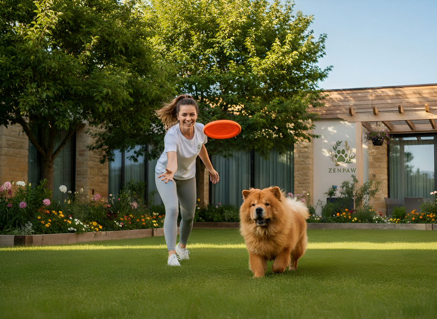 Create a realistic image of a woman playing with her dog in the backyard of a pet-friendly hotel. The scene is outdoors, surrounded by nature — green grass, trees, and a pleasant sunny atmosphere. The woman is smiling and throwing a dog frisbee, while a Chow Chow dog is happily running after it. The hotel building can be seen in the background, with a visible logo (see attached file) subtly placed on a wall or sign. The image should be high-quality, photorealistic, and convey a joyful, natural, and relaxed vibe — like a professional lifestyle photo for a luxury pet hotel.