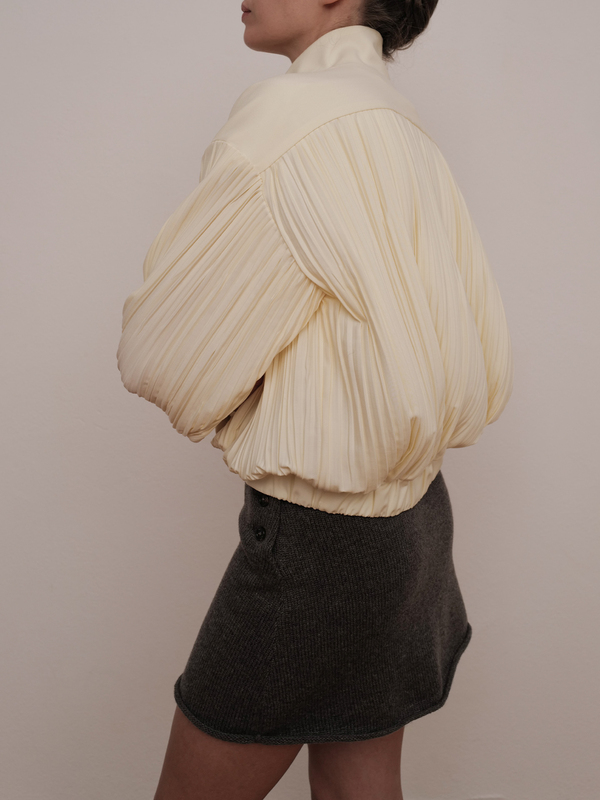 • Мини-юбка Baby swan: вязаная юбка серо-коричневого цвета на пуговицах, из той же ткани, что и свитер. • Жакет Pearl Fisher: абрикосовый жакет из тафты на хлопковой подкладке. Особенности модели: укороченный перед, пышные рукава, стянутые у запястья, и пуговицы персикового оттенка. • Шорты Kiss from a sword: серо-голубая модель из двух видов шелка, сшитых вместе для создания эффекта отблеска меча. Шорты на резинке, низ обработан ручными стежками.