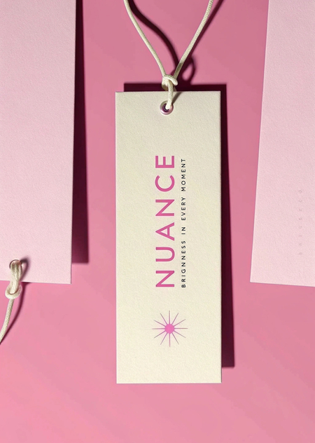 Two minimalist hang tags, made of thick, textured off-white or cream cardstock with slightly rough, deckled edges.--ar 3:2 --style raw --v 5.2