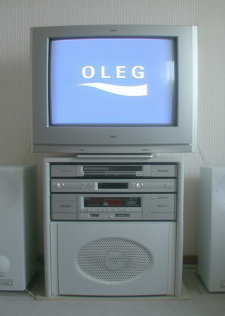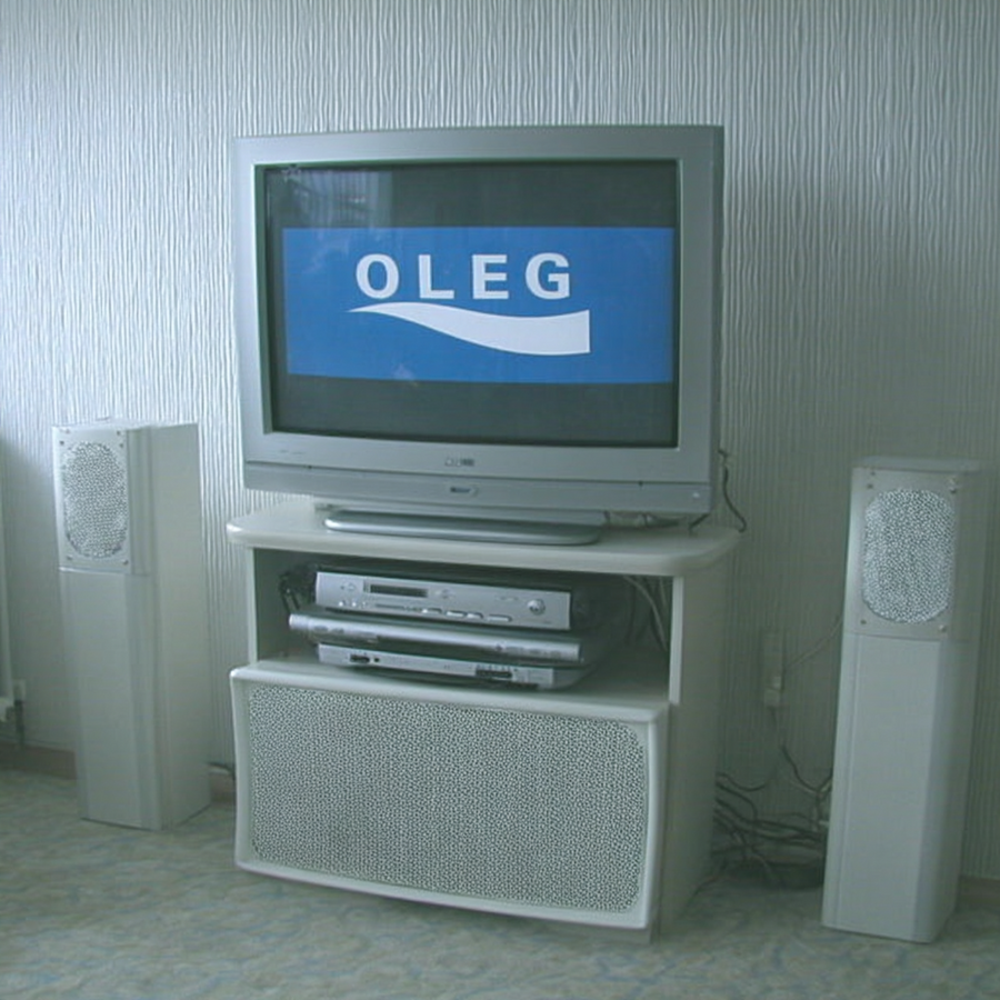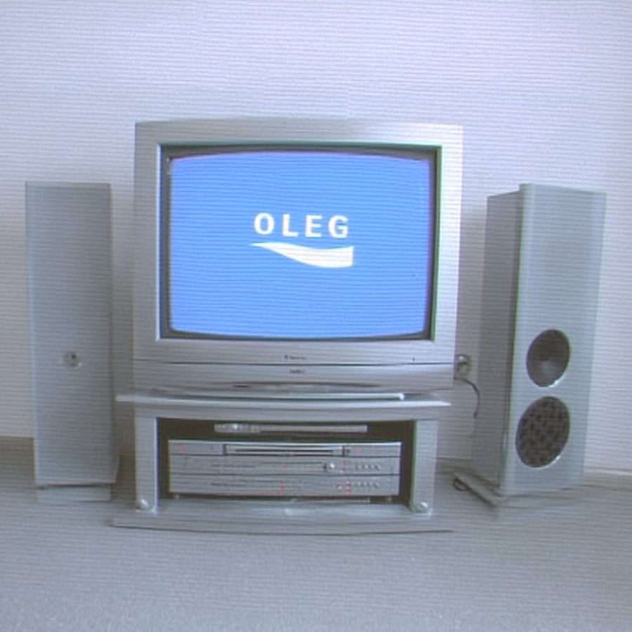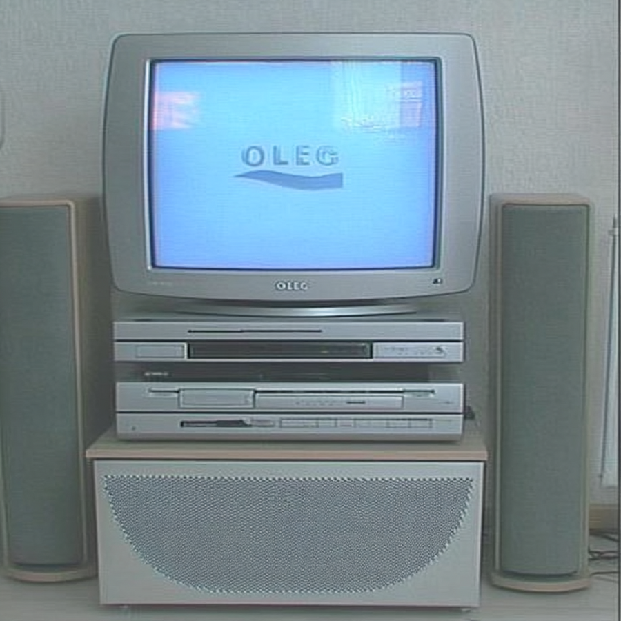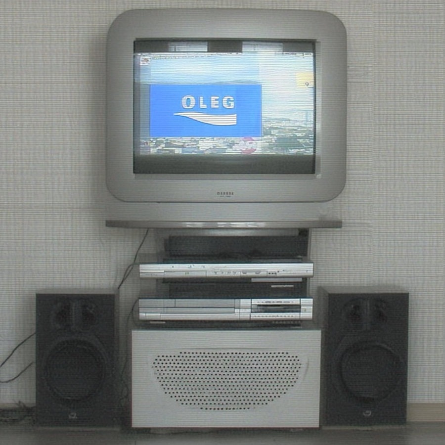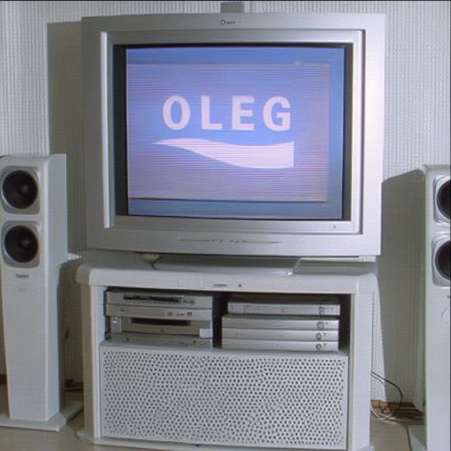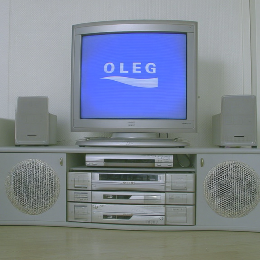 early-1990s Scandinavian Hi-Fi living-room scene — silver-grey Bang-& -Olufsen-style CRT television with rounded square bezel, playing «OLEG» logo white letters on bright blue background, strong contrast, matched stacked silver VHS and CD units beneath, large integrated floor sub-speaker cabinet with circular mesh grille, symmetrical satellite speakers on wall, neutral white textured wallpaper, soft daylight, minimalist cables, overall desaturated palette, slight film-grain, shot straight-on centered framing