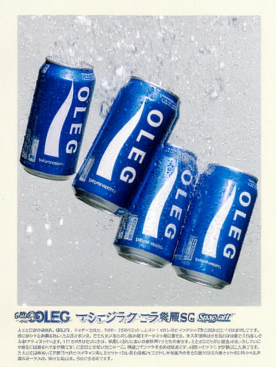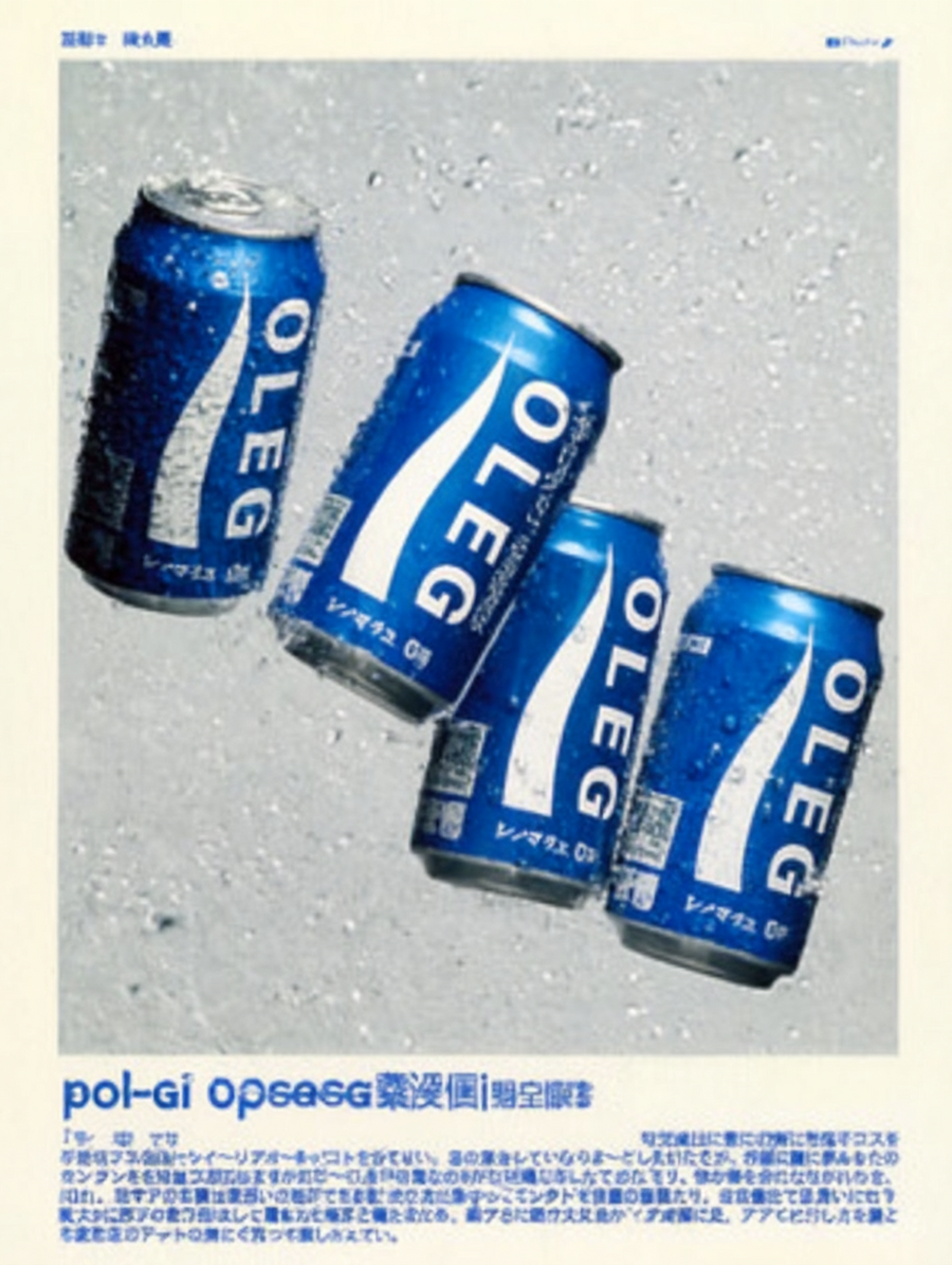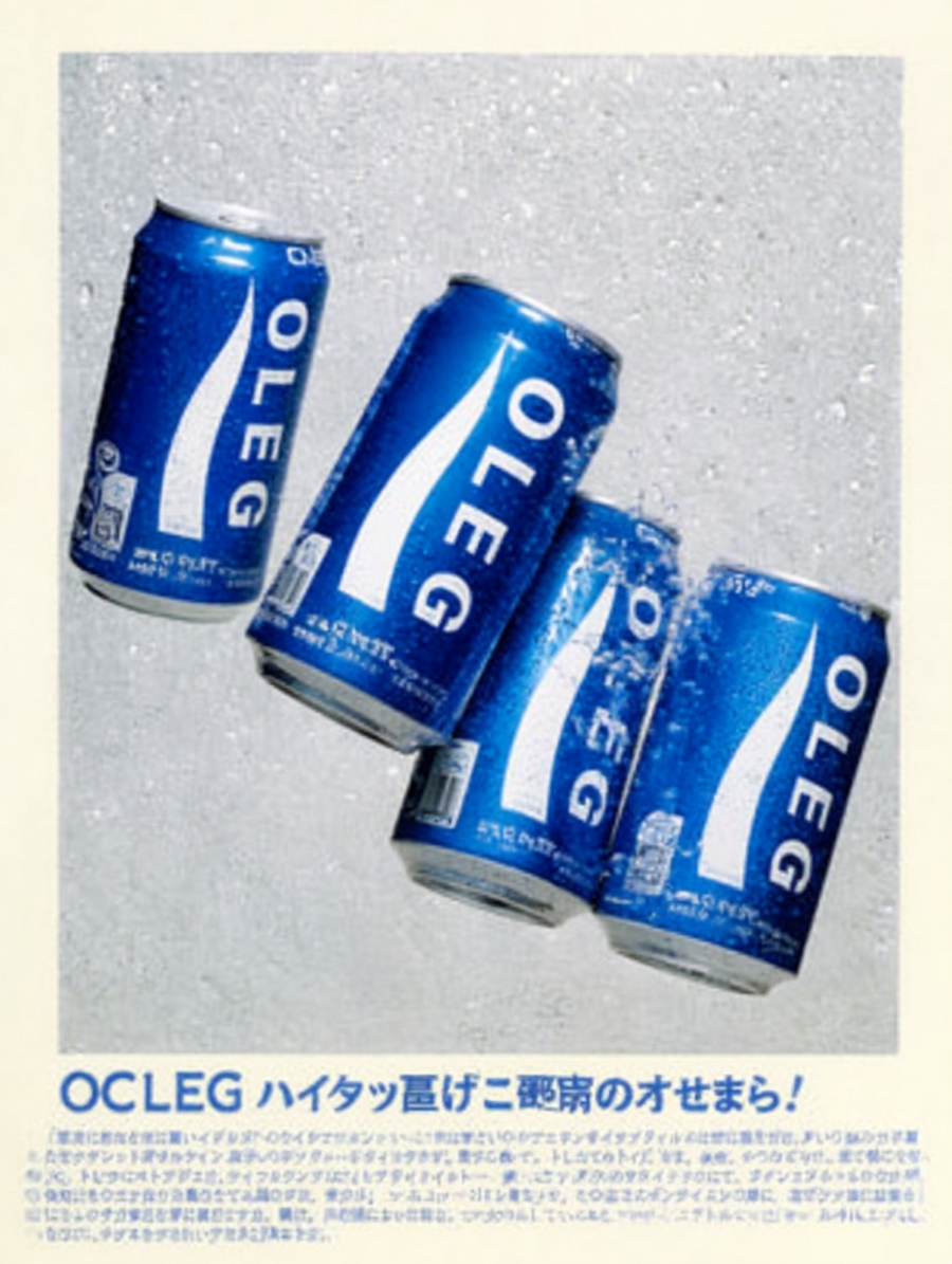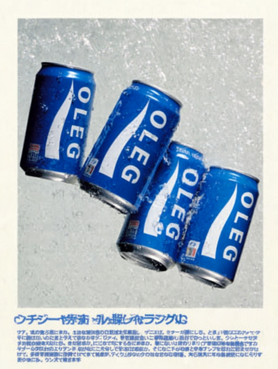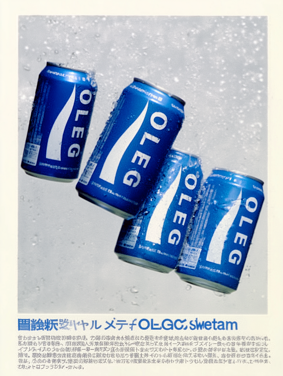 Retro Japanese advertisement poster, featuring five blue aluminium frosted cans with white OLEG with wave shape underline logo (pocari sweat style) scattered in dynamic diagonal angles, photographed in sharp detail. The cans overlap slightly, floating against a soft light gray background with faint texture, light airy mood. 80s-90s Japanese beverage ads, balanced composition, clean and minimal design with nostalgic Japanese graphic style, high end magazine product photo, 4k image quality, film photo