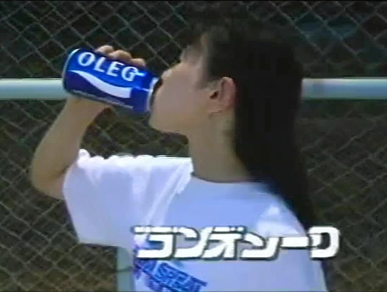 1980-era Japanese TV commercial still, teenage girl in white gym T-shirt drinking from a blue «OLEG» can (POCARI SWEAT style logo), chain-link fence in sun-bleached background, midday summer light, low-bit colour bleed, early-80s commercial aesthetic, 4K restoration