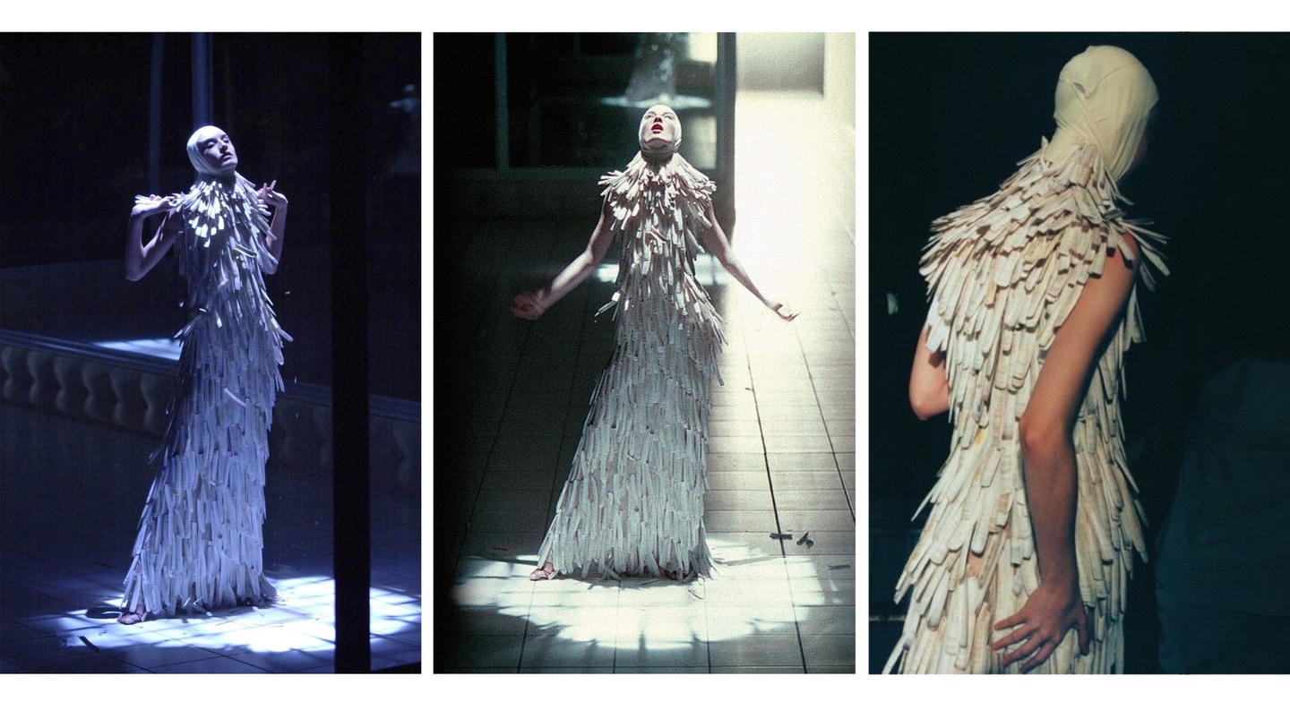На показе Александра Маккуина «Восс», весна–лето 2001, мода превратилась в настоящую психологическую сцену. Модели выходили с плотно обёрнутыми муслином головами, будто их лица скрывали импровизированные повязки или следы медицинских манипуляций. Вместо привычной подиумной походки они двигались неуверенно: то покачиваясь, то натыкаясь на стеклянные стены, то впадая в странное возбуждение — смеялись, хватались за голову, реагировали на пространство так, будто внутри него происходило что-то, с чем они не могли справиться.