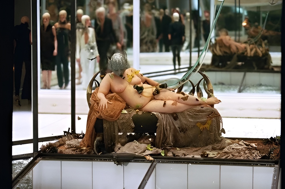 В эпицентре разрушенной конструкции сидела писательница Мишель Олли — обнажённая, с тяжёлым гримом и маской с дыхательной трубкой. Её образ отсылал к визуальному языку Джоэла-Питера Уиткина, особенно к его работе Sanitarium (1983). Позже в своих дневниковых записях Олли описывала концепцию финала и шоу: «Я то, чего большинство из них боится больше всего. Я — толстая»[4]. Композиция финала делает уязвимость не слабостью, а центром высказывания. Маккуин показывает жуткое и прекрасное одновременно: страх перед телом, которое выходит за рамки «нормы», и освобождение, которое случается, когда оболочка — физическая и социальная — трескается. Дизайнер в этом перформансе представляет женскую эмоциональность как силу, способную разрушать пространство, нарушать порядок и создавать новый визуальный язык.