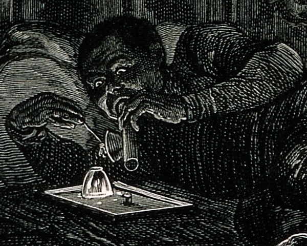 Гравюра изображает оцепеневших курильщиков в мрачном подвале, подчеркивая их упадок через тусклый свет и разбросанные трубки. Образ отражает викторианское лицемерие: Британия, наживавшаяся на опиумной торговле, изображала зависимость как «восточную заразу», скрывая социальные причины проблемы.